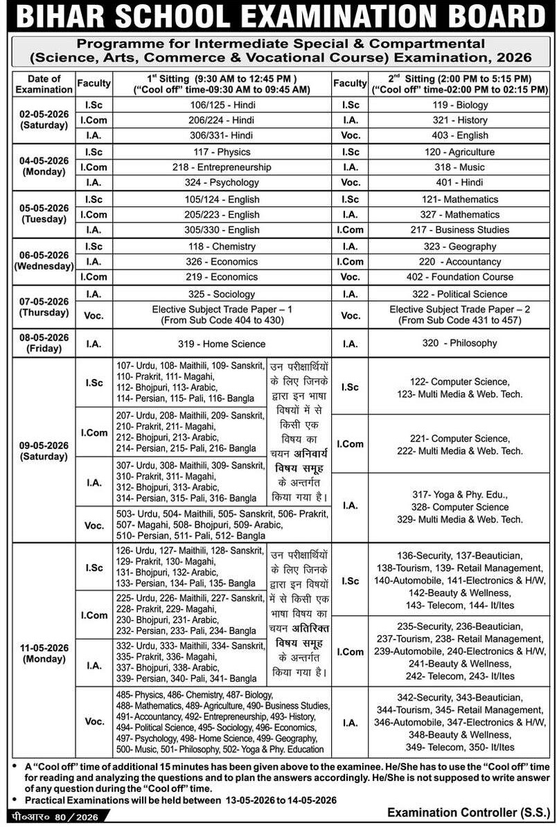 - Bihar Board Inter Special & Compartmental Exam 2026 Schedule Released – Check Complete Details Here