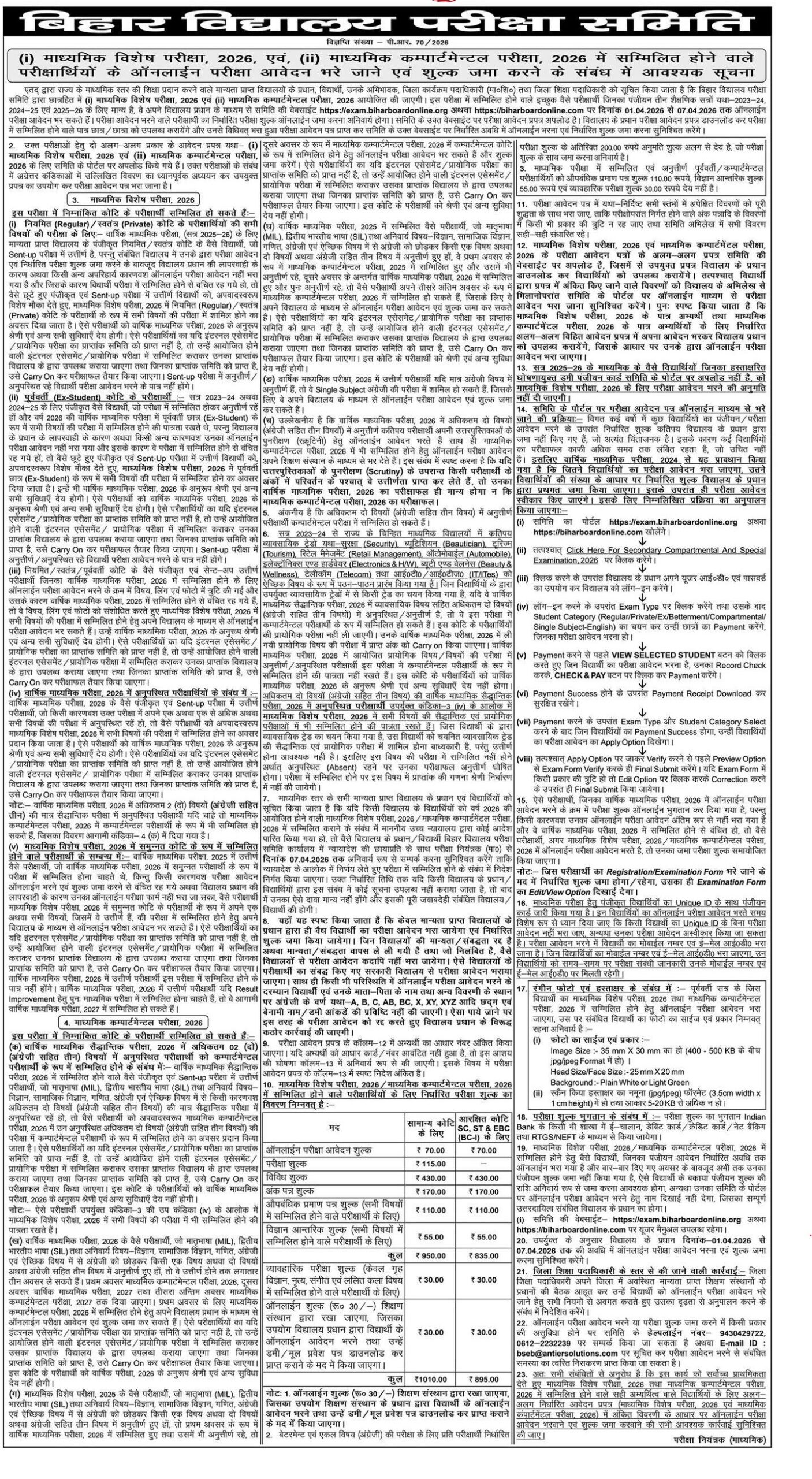 इस बार BSEB ने Regular, Private, Ex-Student, Compartmental, Betterment और Special category के students के लिए form fill-up की सुविधा दी है। आपके notice के अनुसार सभी eligible students अपने school के माध्यम से online आवेदन कर सकते हैं।