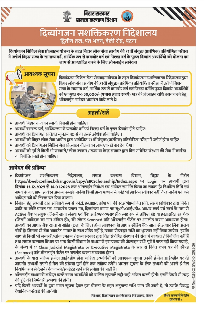 | मुख्यमंत्री दिव्यांग सशक्तिकरण योजना 2025 | 15-12-2025 से 14-01–2026 तक | 71वीं BPSC प्रारम्भिक परीक्षा पास स्टूडेंट | 50,000 /- |