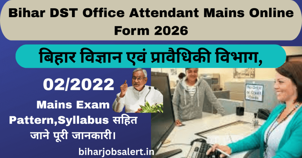 Online Apply Form, Bihar Notifications/Yojna, Latest UpdateBihar DST Office Attendant Mains Exam Online Form 2026 | 02/2022 | Eligibility Mains Exam Pattern,Syllabus सहित जाने पूरी जानकारी। January 6, 2026 🔴 Last Date – 30-01-20263